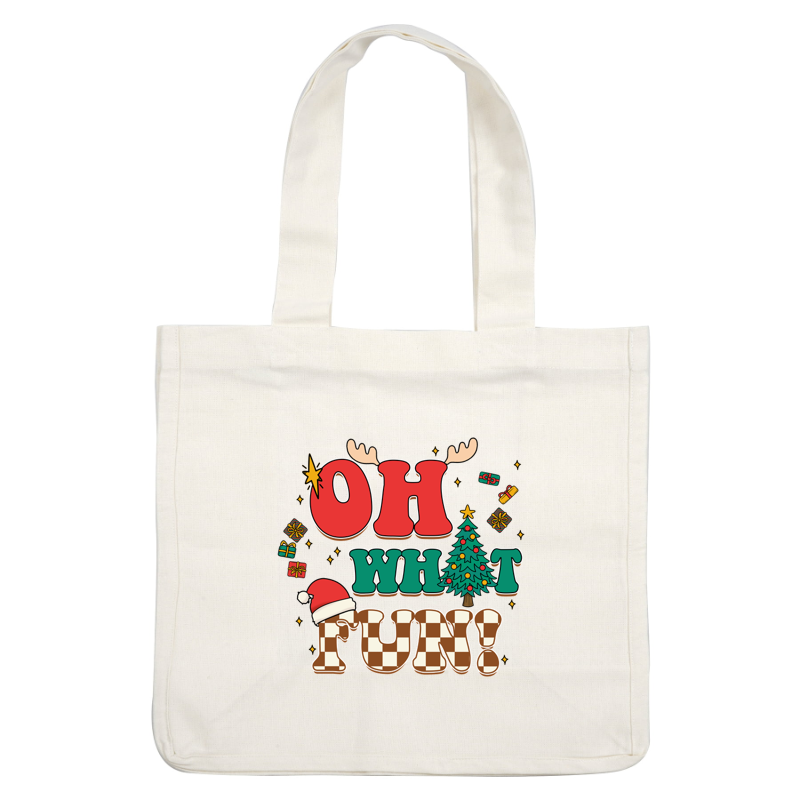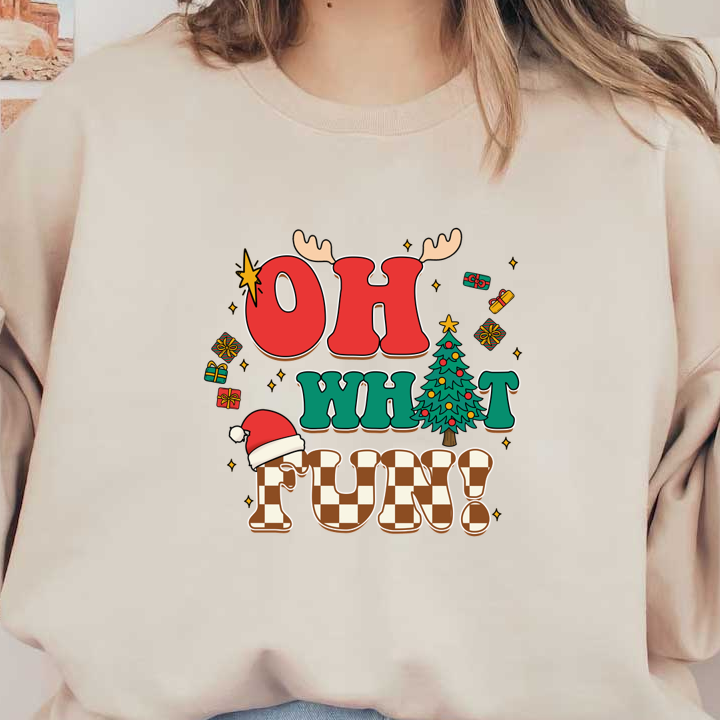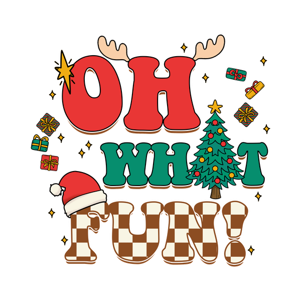 A festive graphic featuring playful text "OH WHAT FUN!" adorned with Christmas decorations like a tree, gifts, and Santa hat. heat press transfers