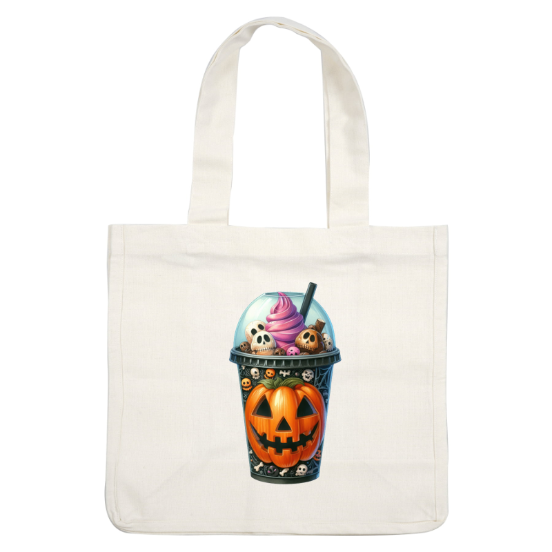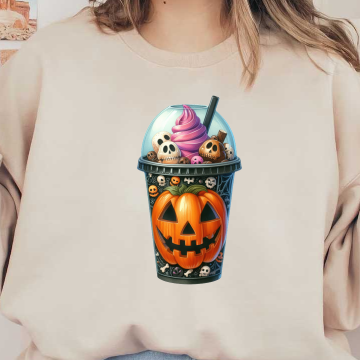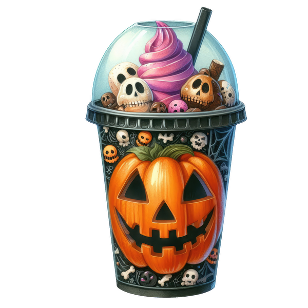 A festive Halloween-themed drink featuring a smiling pumpkin cup, topped with purple swirl ice cream and skull decorations.dtf regular iron