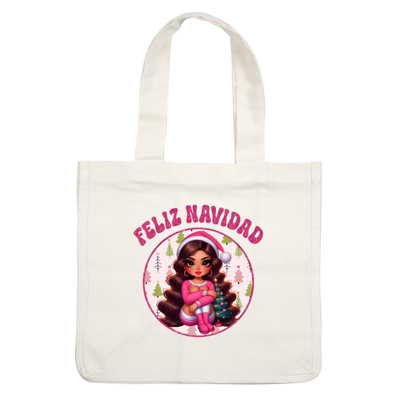A festive illustration featuring a stylish girl in pink pajamas and Santa hat, surrounded by Christmas trees, captioned "Feliz Navidad." dtf prints