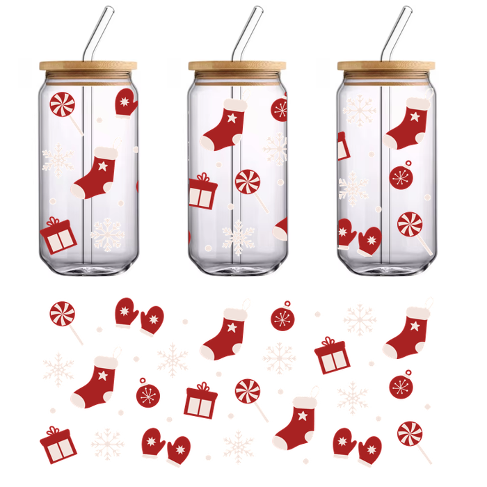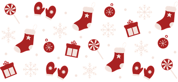 A festive pattern featuring red Christmas stockings, mittens, gifts, candy canes, and snowflakes, perfect for holiday celebrations!UV Transfersdtf regular iron