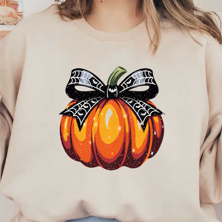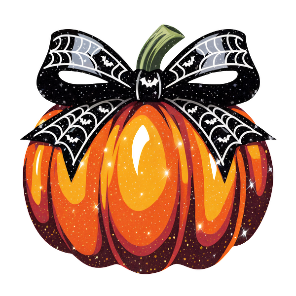 A festive pumpkin adorned with a black spiderweb bow and sparkling details, perfect for Halloween celebrations! dtf transfers