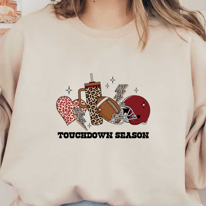 A fun collage featuring a football, helmet, leopard-print cup, and heart, perfect for sports enthusiasts with a stylish twist. heat press transfers