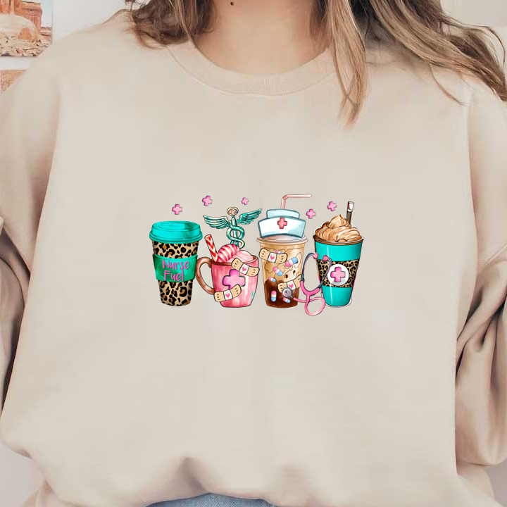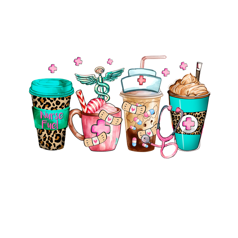 A fun collection of nurse-themed beverage cups, featuring vibrant colors, playful patterns, and medical motifs like band-aids and caduceus.DTF Transfers