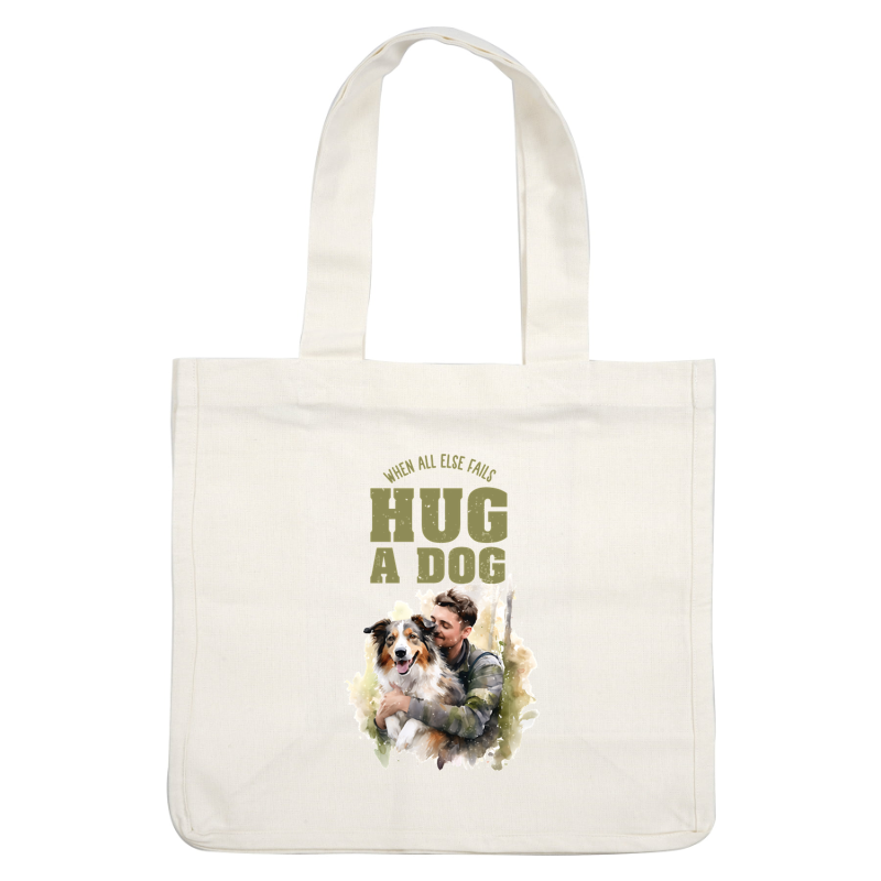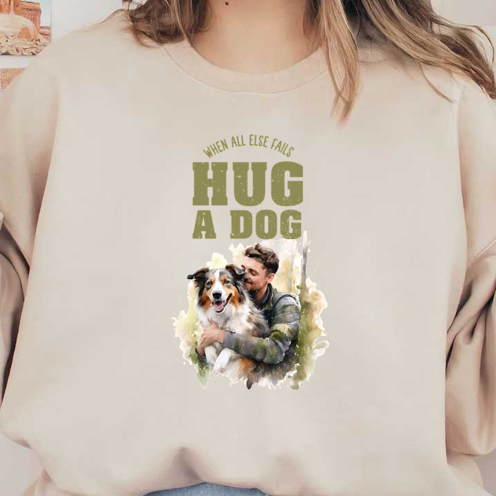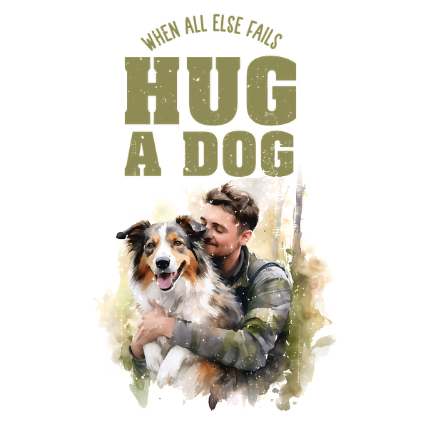 A heartwarming illustration of a man embracing a smiling dog, accompanied by the message, "Hug a Dog."dtf regular iron