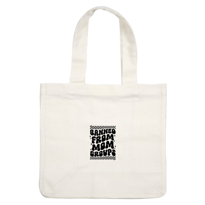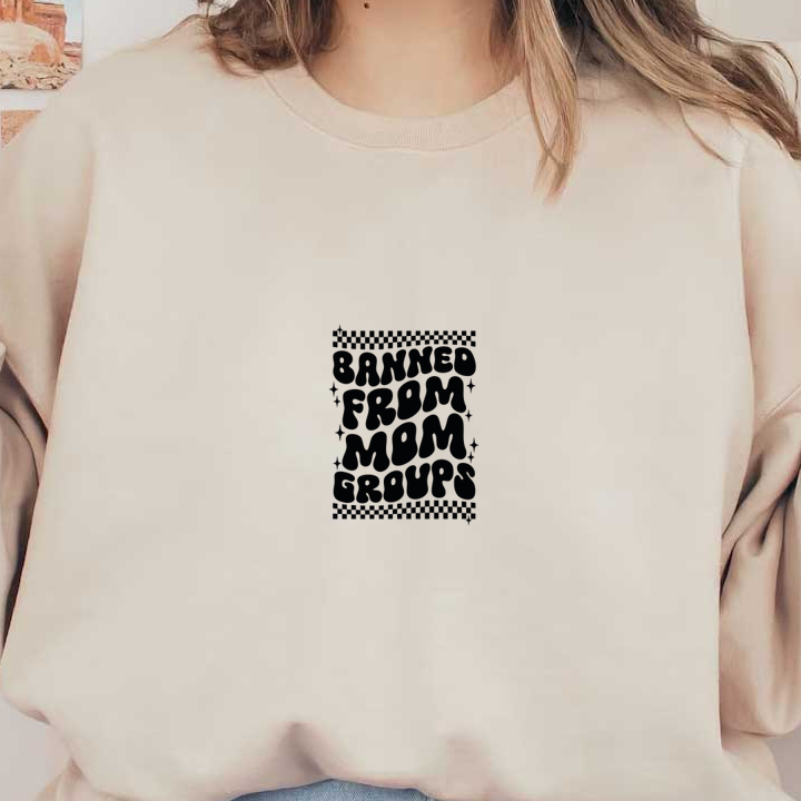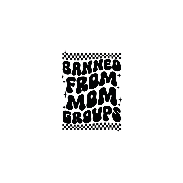 A humorous graphic design featuring the phrase "Banned from Mom Groups" in bold, playful lettering with a fun, whimsical style. heat press transfers