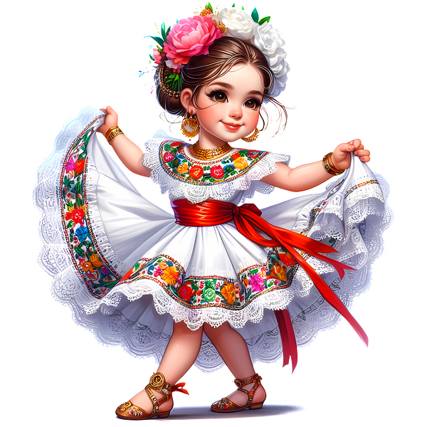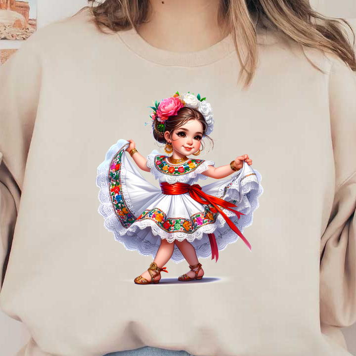 A joyful young girl in a vibrant traditional dress, adorned with floral patterns, twirling gracefully with a colorful ribbon.dtf regular iron