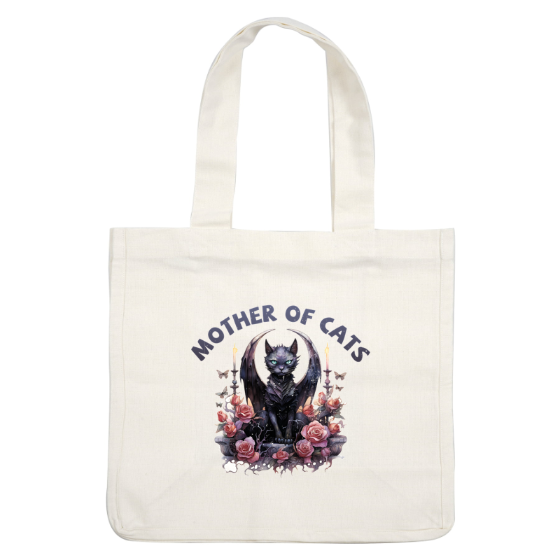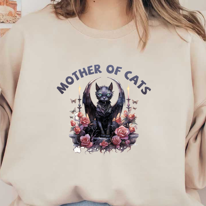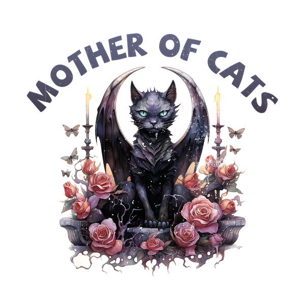 A mystical black cat with wings, surrounded by roses and butterflies, proudly proclaims "Mother of Cats" in stylish lettering. dtf transfers