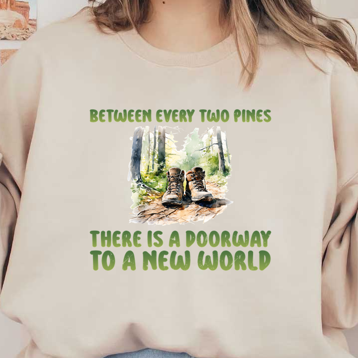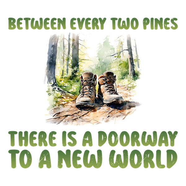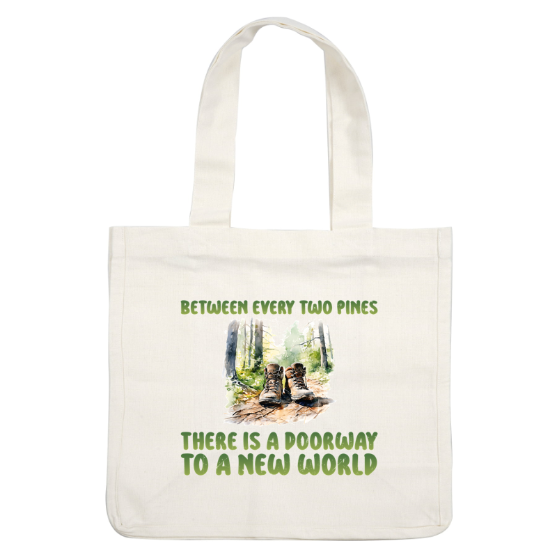 A pair of hiking boots rests on a forest floor, accompanied by an inspiring quote about exploration and new beginnings.dtf regular iron