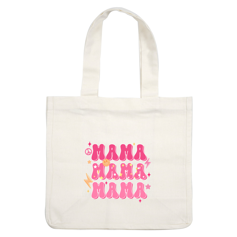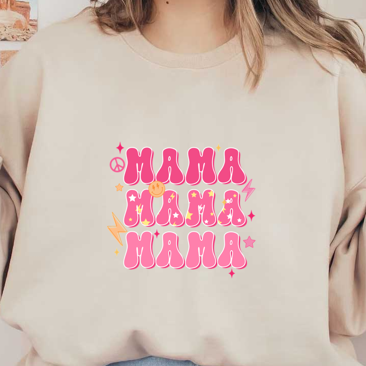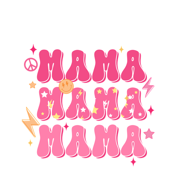 A playful and vibrant design featuring the word "MAMA" in bold pink letters, adorned with stars and playful symbols. dtf transfers