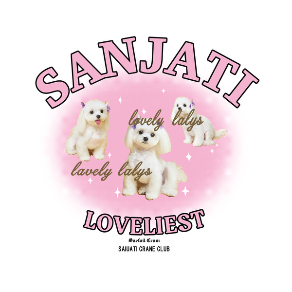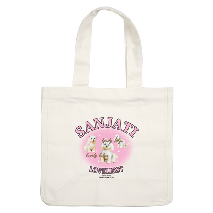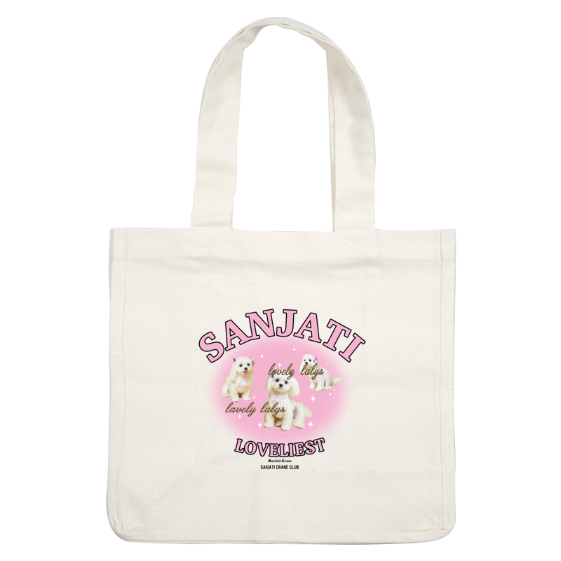 A playful design featuring adorable white puppies against a pink background, highlighting the text "Sanjati Loveliest." dtf transfers