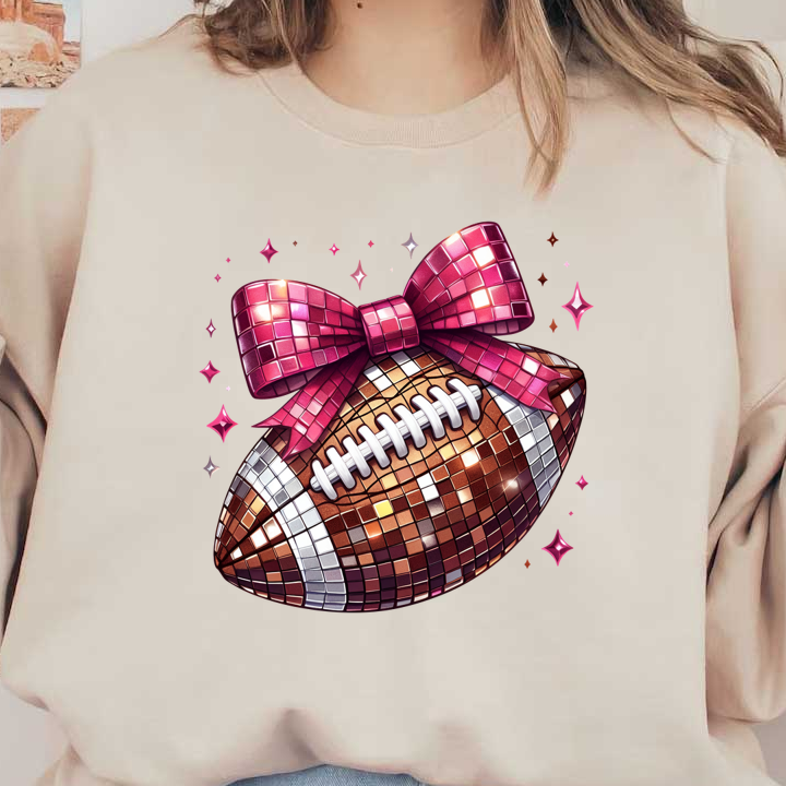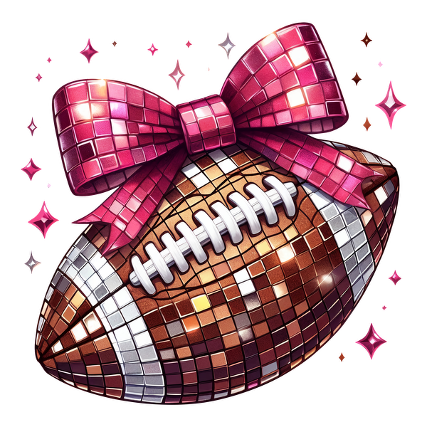 A playful, glittery football adorned with a big pink bow, perfect for a fun celebration or event! dtf prints