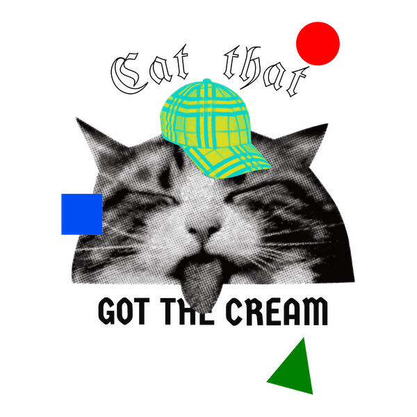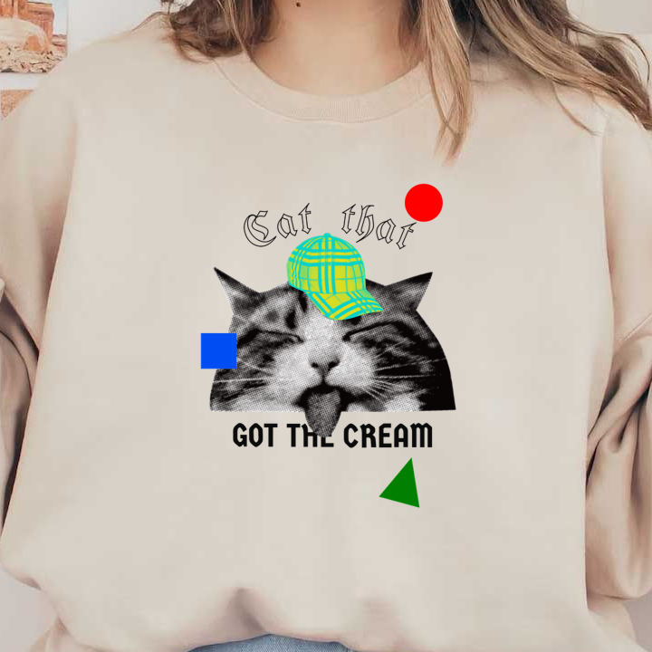 A playful graphic featuring a cat in a vibrant plaid hat, surrounded by colorful geometric shapes and the phrase "Got the Cream."dtf regular iron