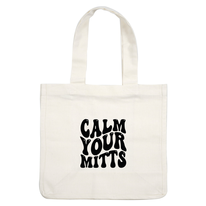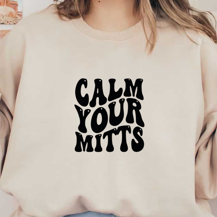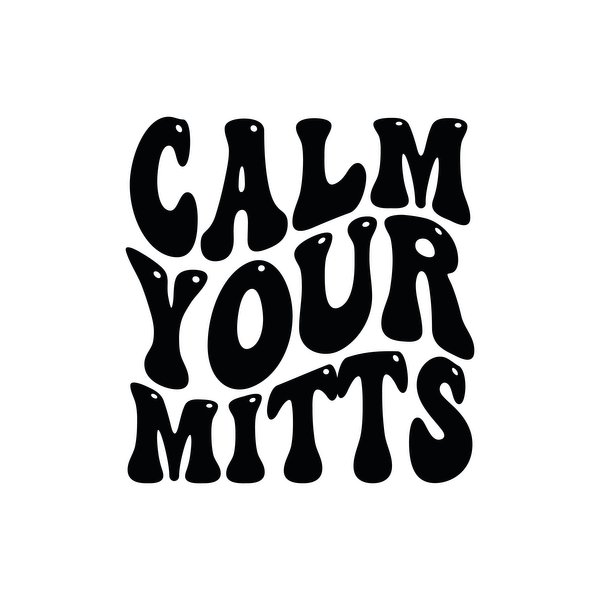 A playful graphic featuring the phrase "Calm Your Mitts" in bold, whimsical lettering. heat press transfers
