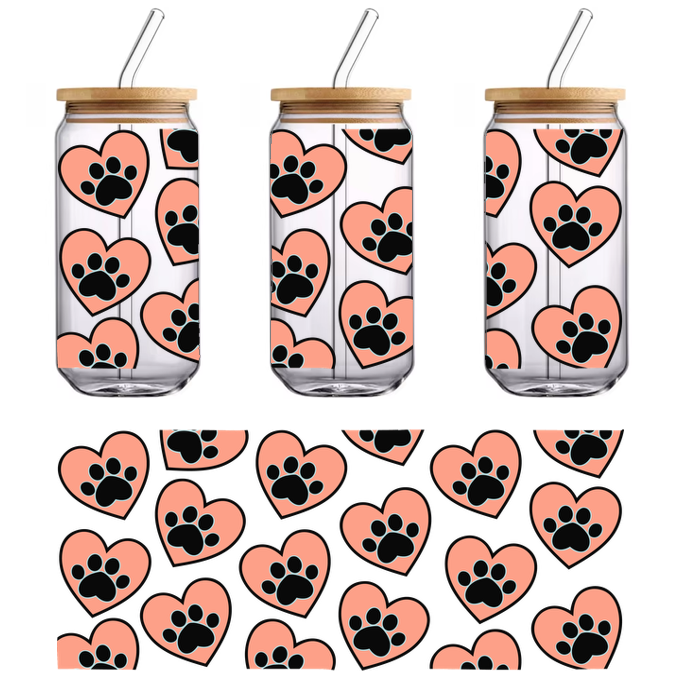 A playful pattern featuring pink hearts adorned with black paw prints on a black background, perfect for animal lovers!UV Transfersdtf regular iron