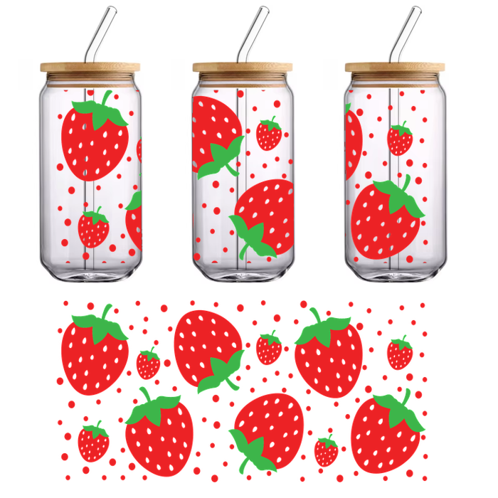 A playful pattern featuring vibrant red strawberries of various sizes, accented with green leaves, perfect for a summer theme.UV Transfers dtf prints