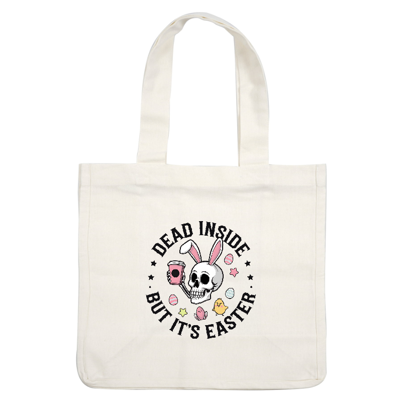 A quirky Easter-themed design featuring a skull with bunny ears, holding a drink, surrounded by colorful eggs and stars.DTF Transfers