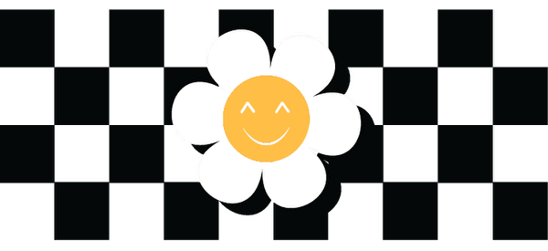 A smiley face with a four leaf clover on a polka dot background.UV Transfers