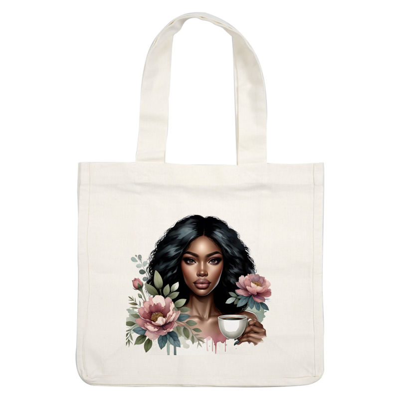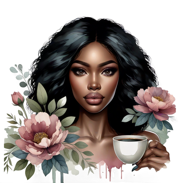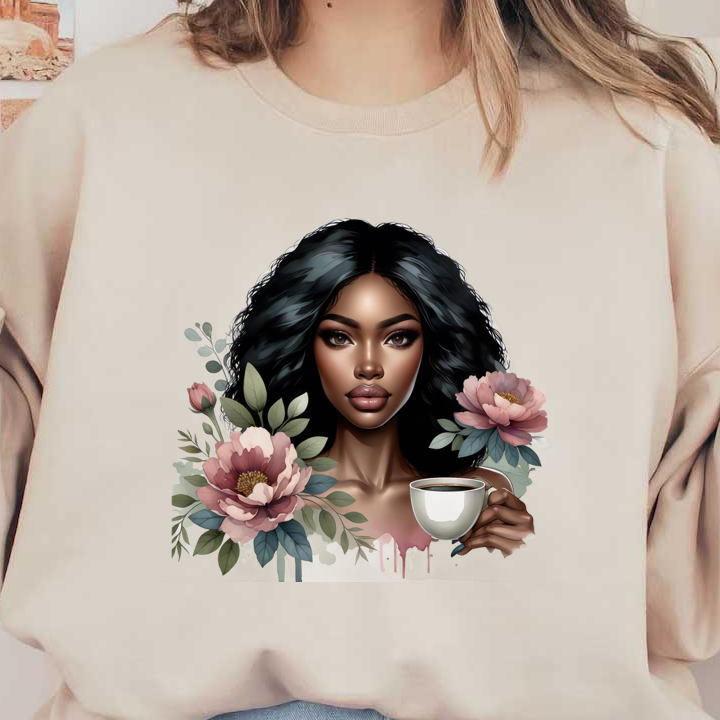 A stunning portrait of a woman with flowing hair, holding a coffee cup, surrounded by beautiful floral accents. dtf prints