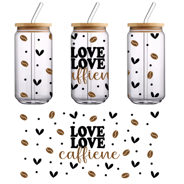 A stylish coffee-themed graphic featuring the playful word "caffeine" surrounded by scattered coffee beans, perfect for coffee lovers.UV Transfersdtf regular iron