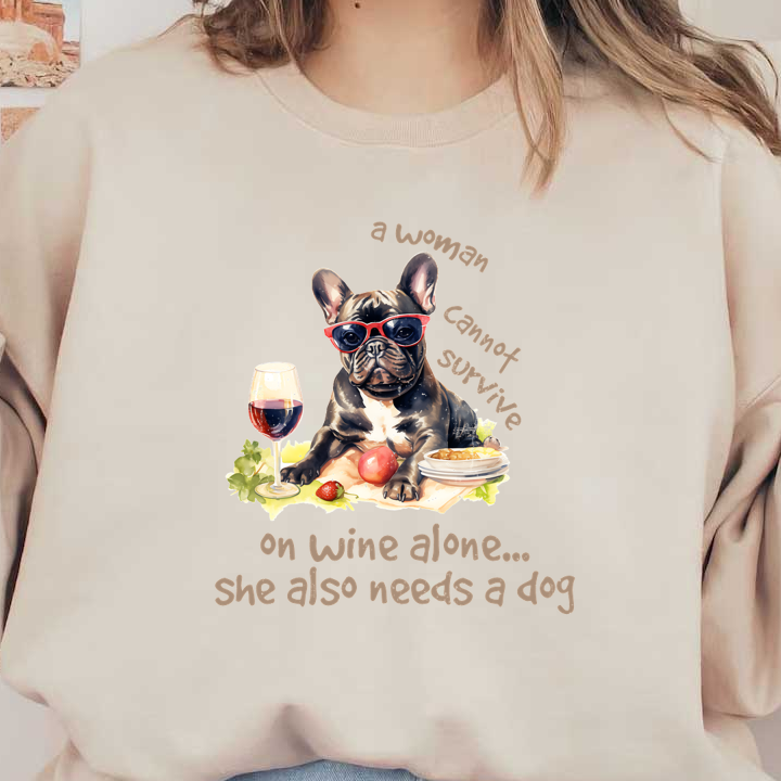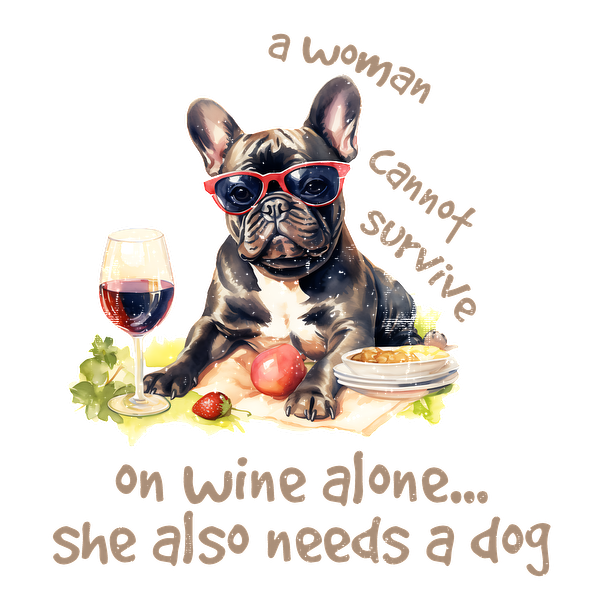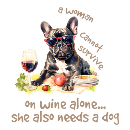 A stylish French bulldog in sunglasses enjoys wine and snacks, captioned humorously about needing both wine and a dog.dtf regular iron