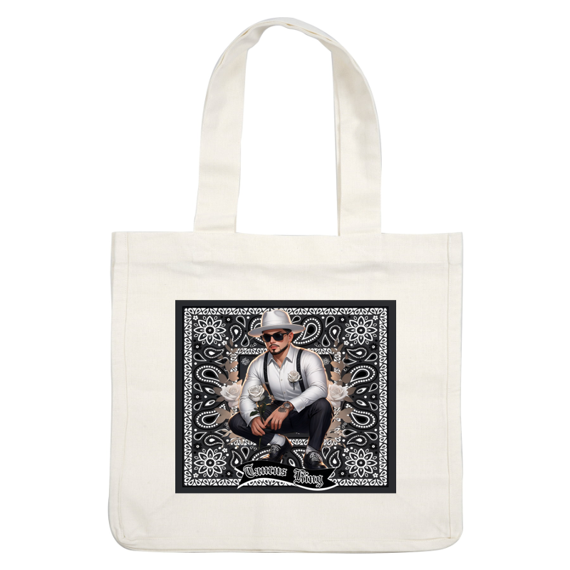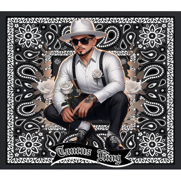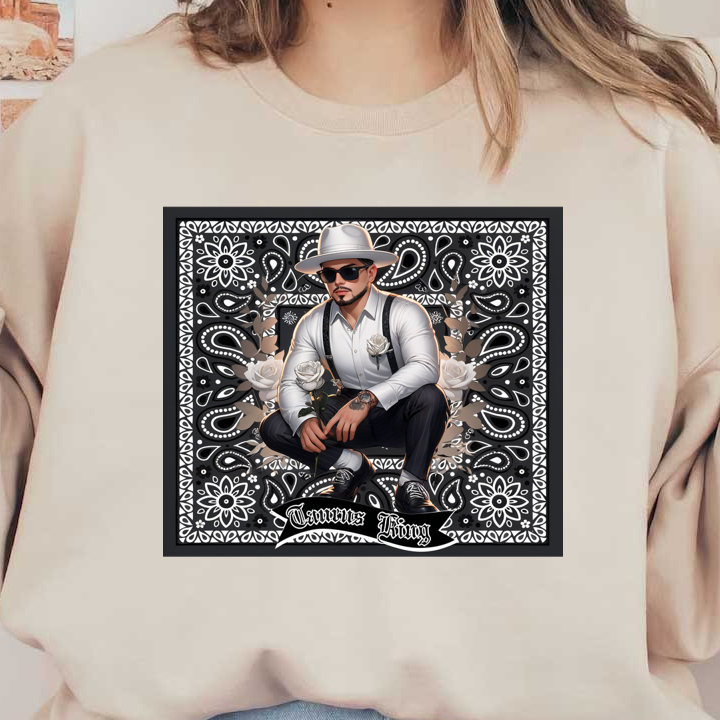 A stylish man in a white shirt and suspenders poses with a rose, set against an intricate floral backdrop, labeled "Taurus King."dtf regular iron