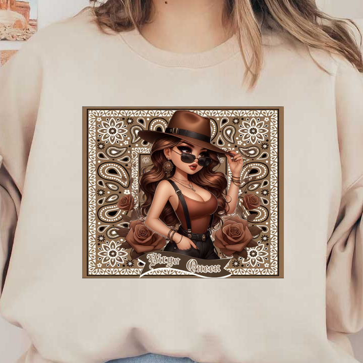 A stylish young woman in a brown hat and sunglasses poses with confidence, surrounded by floral designs and roses. dtf transfers