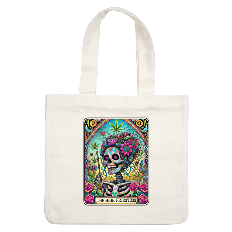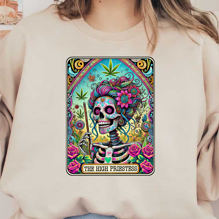 A vibrant and colorful illustration of a skeleton adorned with flowers and marijuana leaves, titled "The High Priestess." heat press transfers