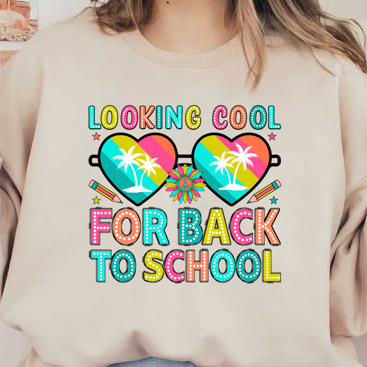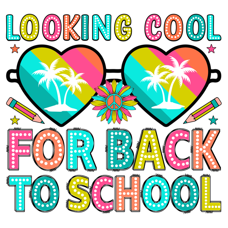 A vibrant and fun graphic design celebrating "Looking Cool for Back to School," featuring hearts, palm trees, and colorful elements.DTF Transfers