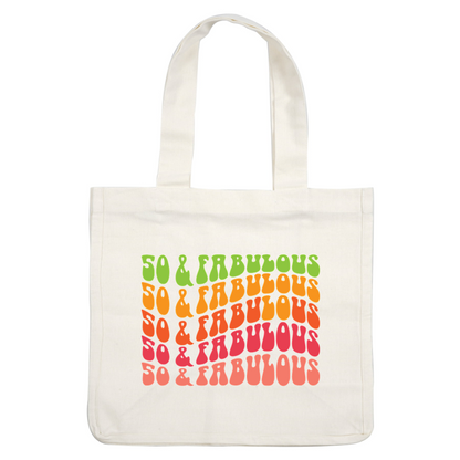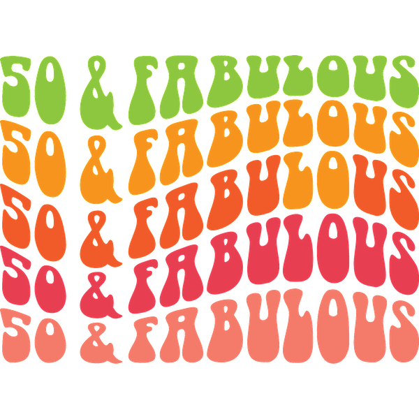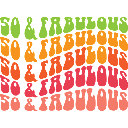 A vibrant and playful graphic featuring the phrase "50 & Fabulous" in bold, colorful, retro-style lettering. dtf transfers