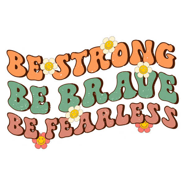 A vibrant and playful motivational design featuring the phrases "Be Strong," "Be Brave," and "Be Fearless," adorned with cheerful flowers.dtf regular iron