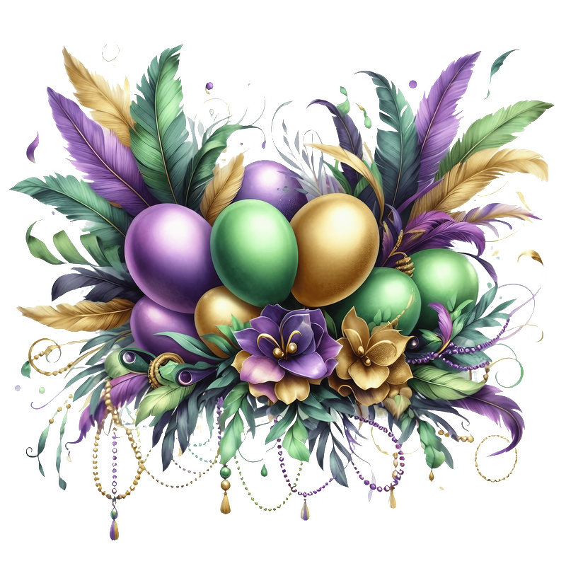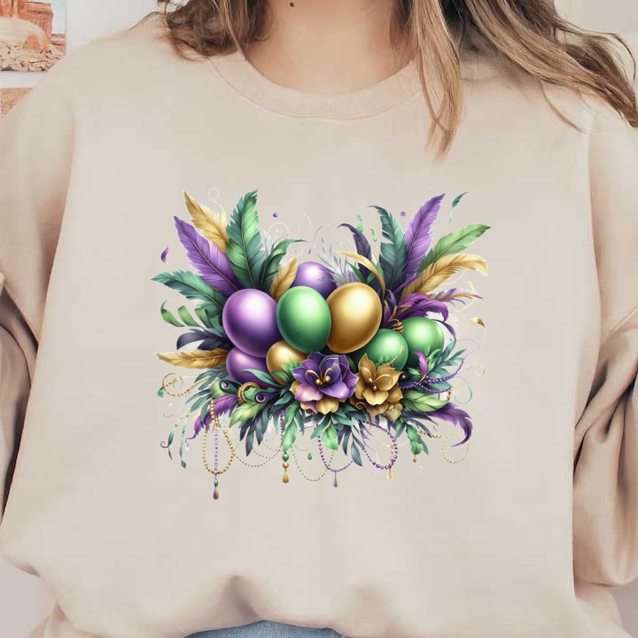 A vibrant arrangement of purple, green, and gold eggs adorned with feathers and flowers, perfect for festive celebrations.DTF Transfers