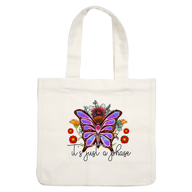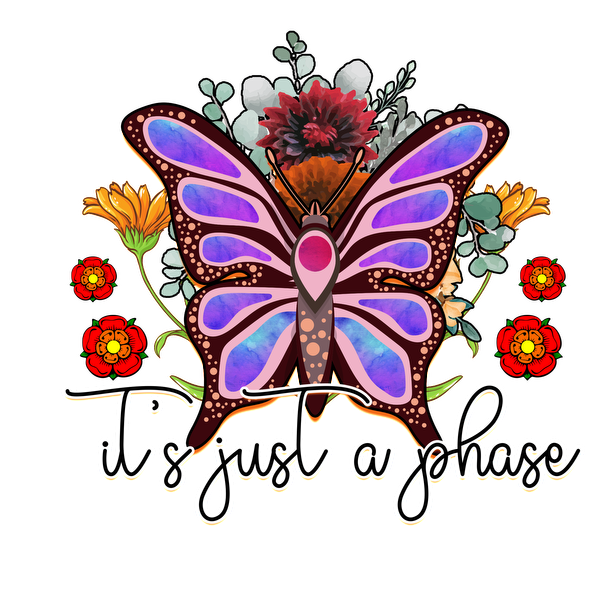 A vibrant butterfly adorned with flowers and the phrase "it's just a phase," blending nature with a whimsical message.dtf regular iron
