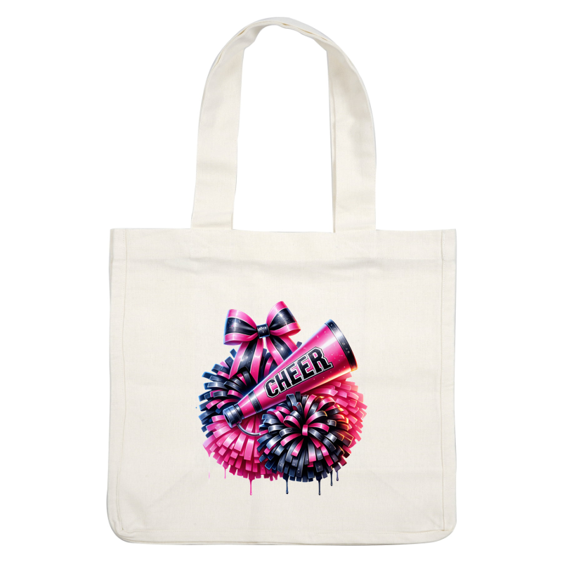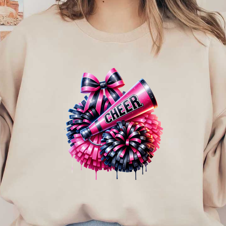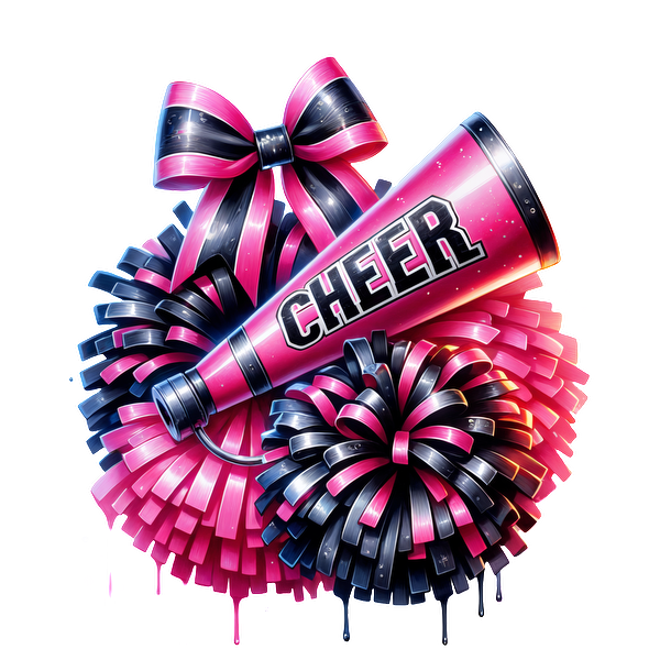 A vibrant cheerleading arrangement featuring pink and black pom-poms, a "CHEER" megaphone, and a stylish bow.DTF Transfers dtf prints