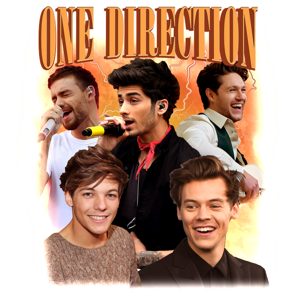 A vibrant collage featuring the popular band One Direction with dynamic performances and smiling faces of its members.DTF Transfers heat press transfers