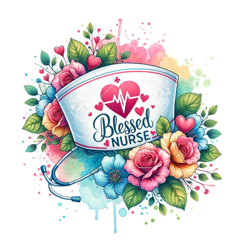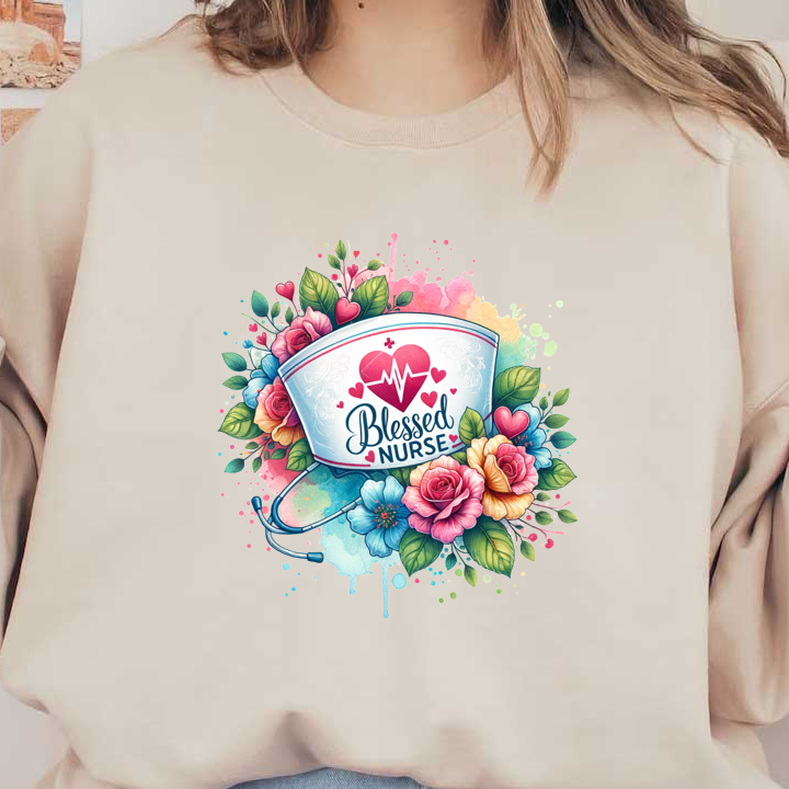 A vibrant design featuring a decorated nurse's cap surrounded by colorful flowers, celebrating the theme "Blessed Nurse."DTF Transfers