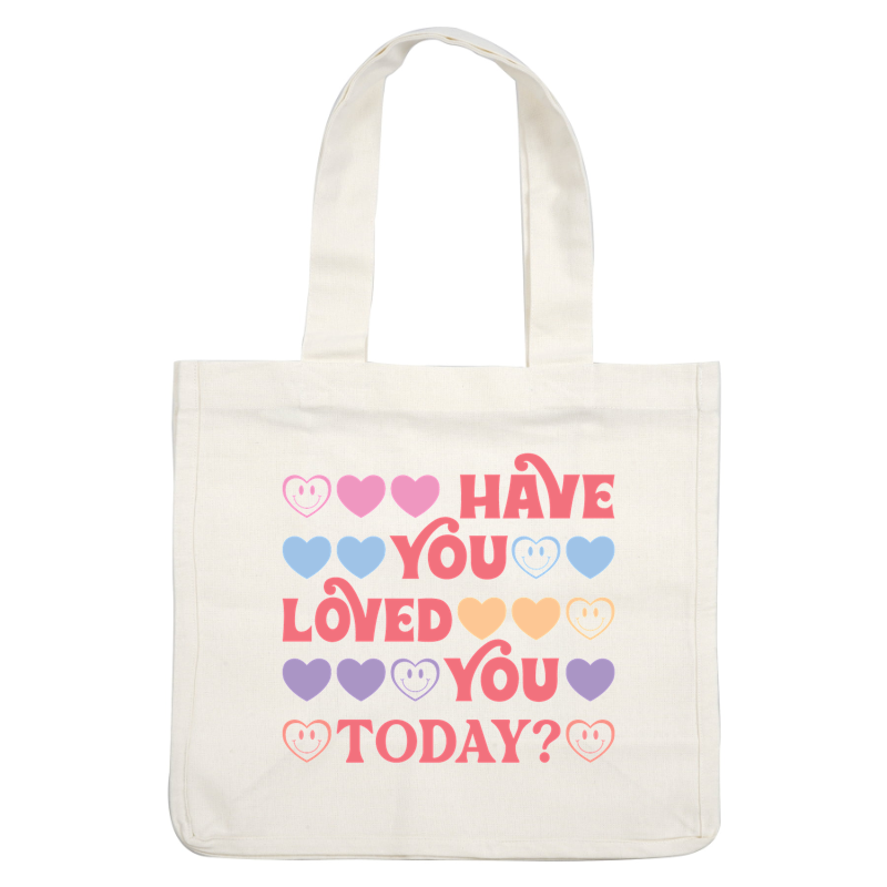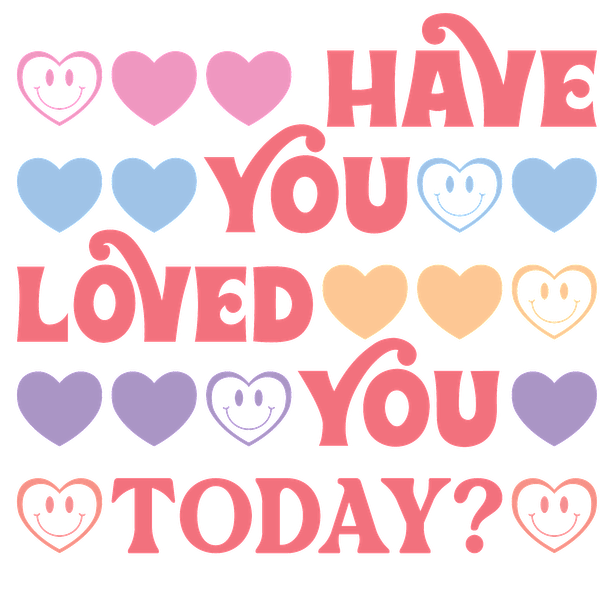 A vibrant design featuring playful text that reads, "Have you loved you today?" surrounded by colorful hearts.dtf regular iron