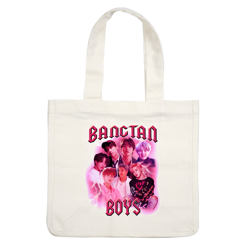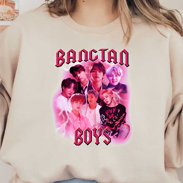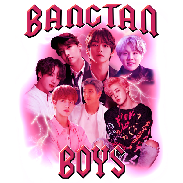 A vibrant fan art collage featuring the members of BTS with bold text and lightning effects, celebrating their iconic status.DTF Transfers heat press transfers
