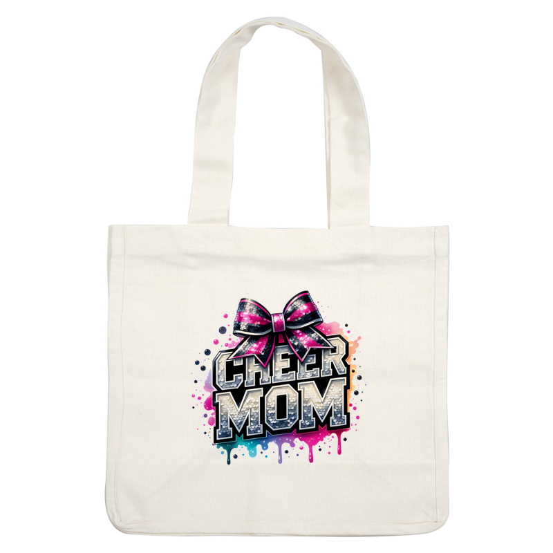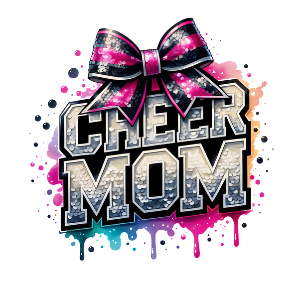 A vibrant graphic design featuring the words "CHEER MOM" adorned with a shiny bow and colorful splashes, celebrating cheerleading pride.DTF Transfers dtf transfers