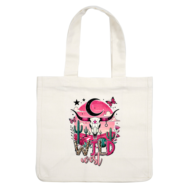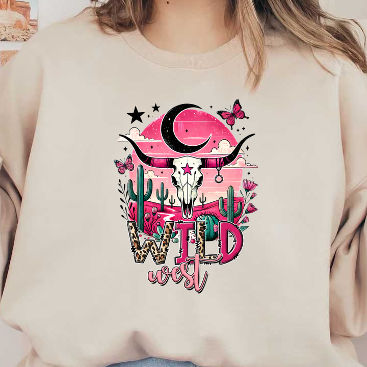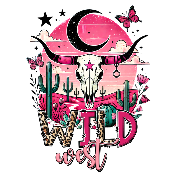 A vibrant graphic featuring a bull skull against a pink sunset, adorned with cacti and the text "Wild West." dtf transfers