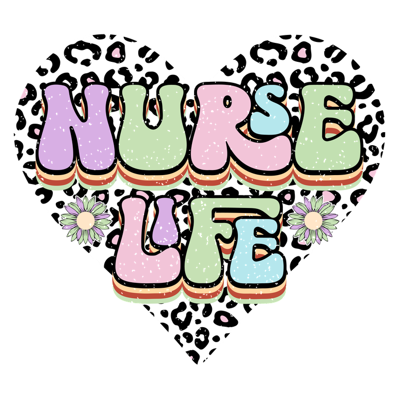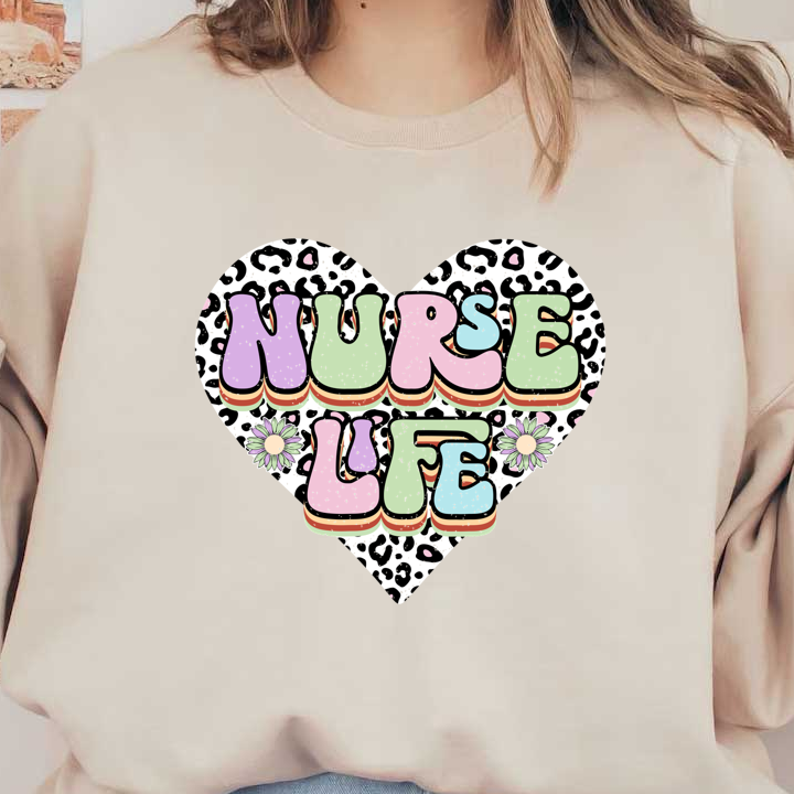 A vibrant heart-shaped design featuring the playful text "NURSE LIFE" in colorful, bold letters with cheerful flowers and a leopard print background.DTF Transfers