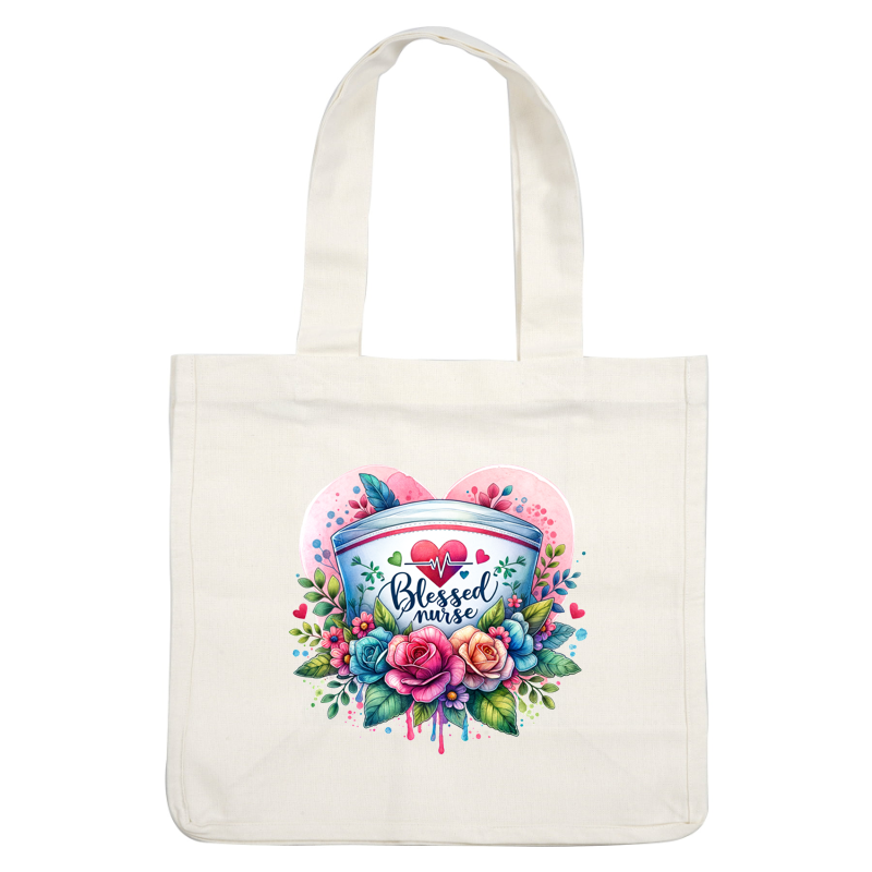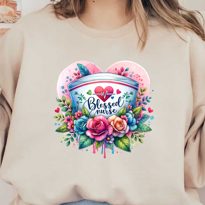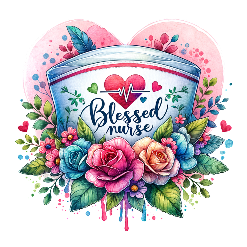 A vibrant illustration featuring a nurse's cap adorned with colorful flowers and the phrase "Blessed Nurse" surrounded by hearts and leaves.DTF Transfers