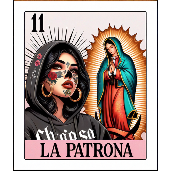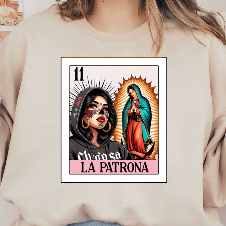 A vibrant illustration featuring a woman with a floral skull design, wearing a hoodie, alongside an image of the Virgin Mary.dtf regular iron