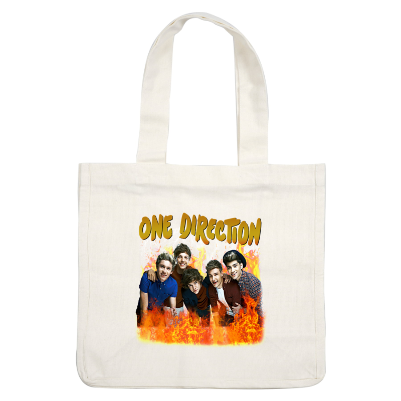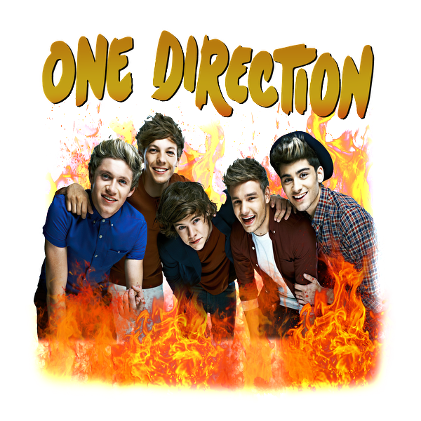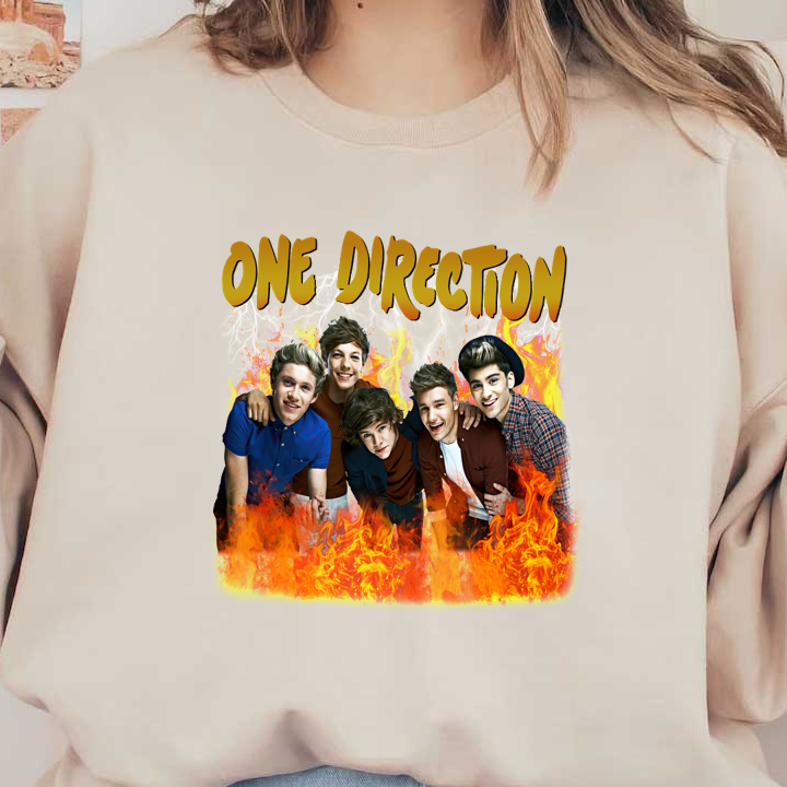 A vibrant image of One Direction, featuring the five members smiling, surrounded by a fiery graphic backdrop.DTF Transfers heat press transfers
