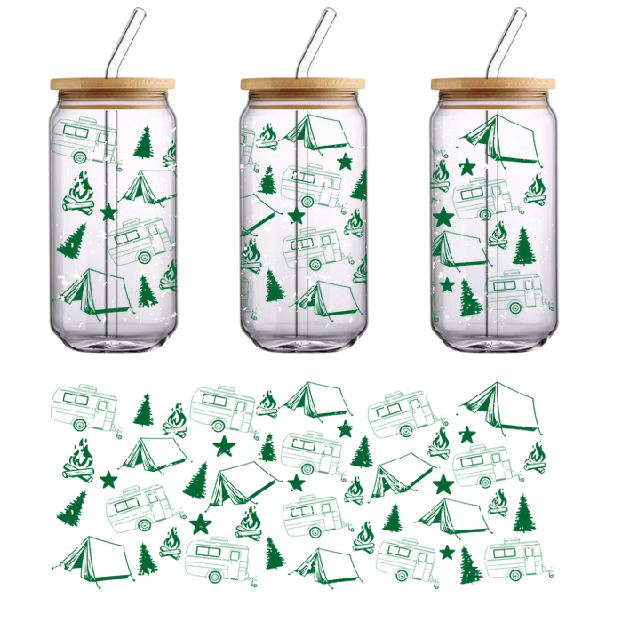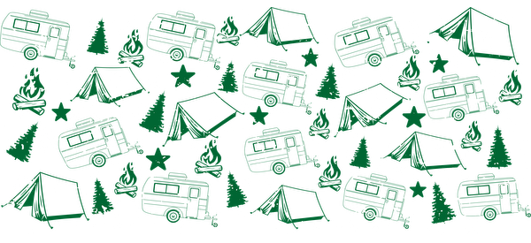 A vibrant pattern featuring green camping trailers, tents, and trees, perfect for outdoor enthusiasts and camping lovers.UV Transfers dtf prints