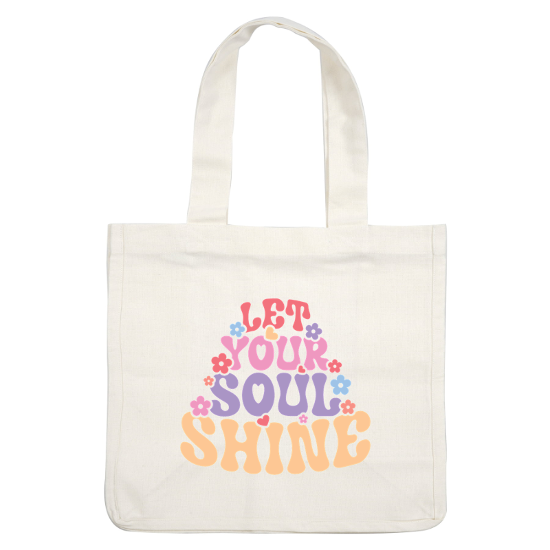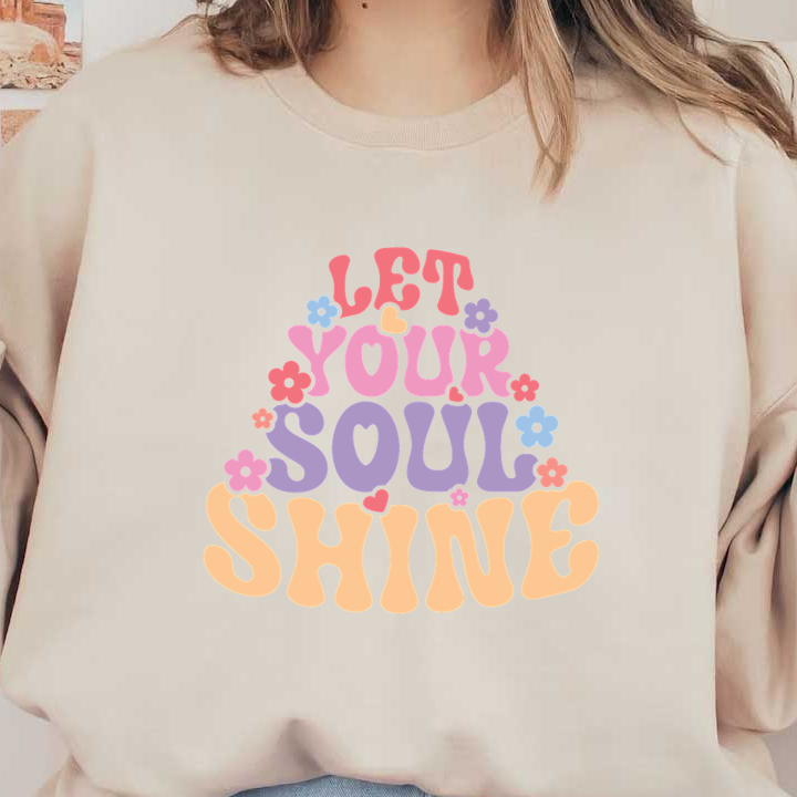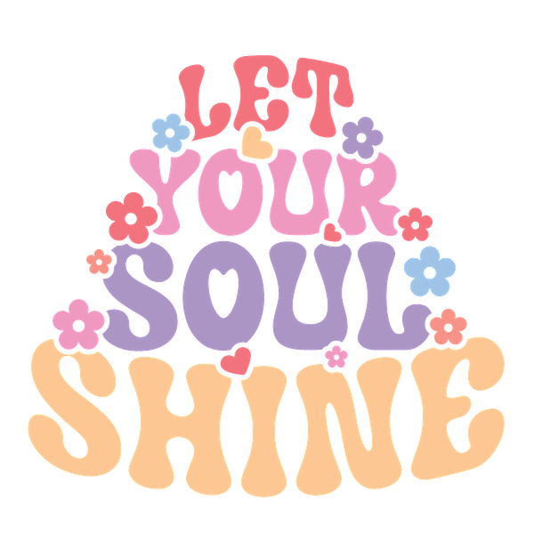A vibrant, retro-style graphic featuring the phrase "Let Your Soul Shine" surrounded by colorful flowers. heat press transfers