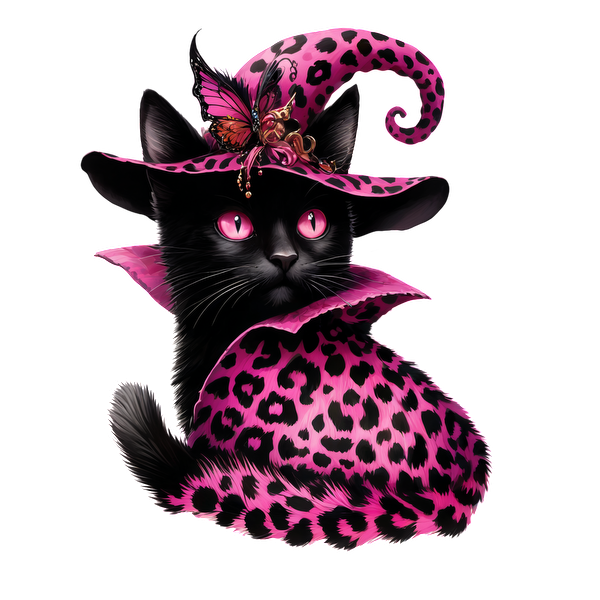 A whimsical black cat wearing a stylish pink leopard-print witch hat, adorned with a butterfly, exuding charm and magic. dtf transfers