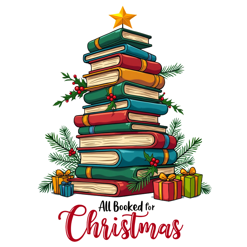A whimsical design featuring a stack of colorful books styled as a Christmas tree, adorned with gifts and greenery.DTF Transfers