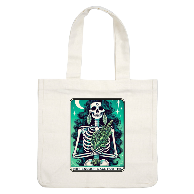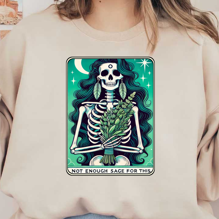 A whimsical illustration featuring a skeleton holding sage, surrounded by a dreamy green backdrop and a playful message.dtf regular iron