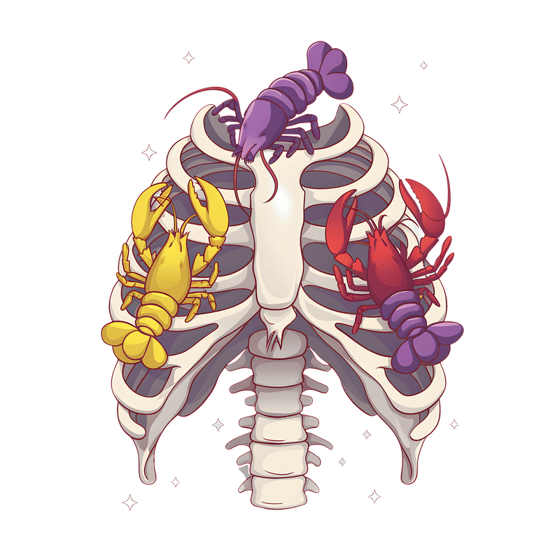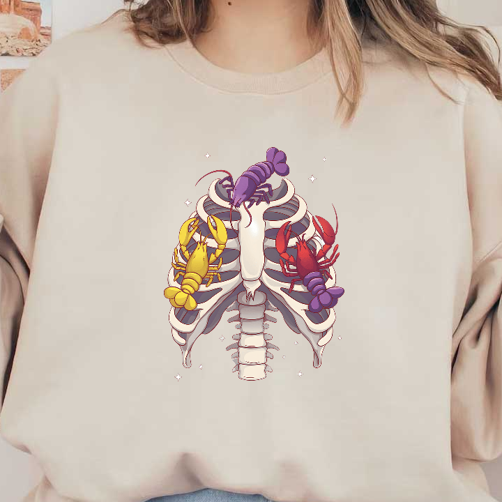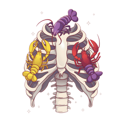 A whimsical illustration featuring colorful lobsters perched on a stylized human ribcage, blending marine life with anatomical design.DTF Transfers