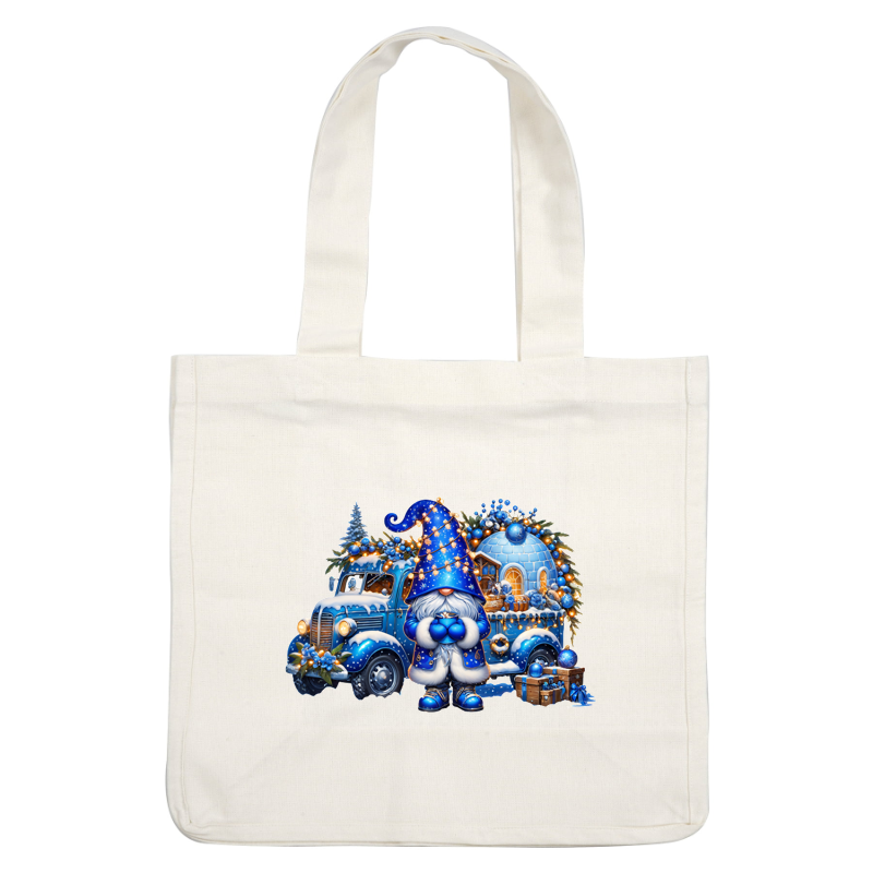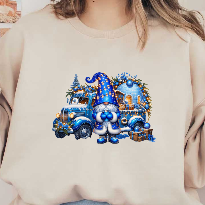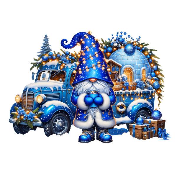 A whimsical winter scene featuring a blue truck adorned with Christmas decorations and a gnome holding festive ornaments.DTF Transfers heat press transfers